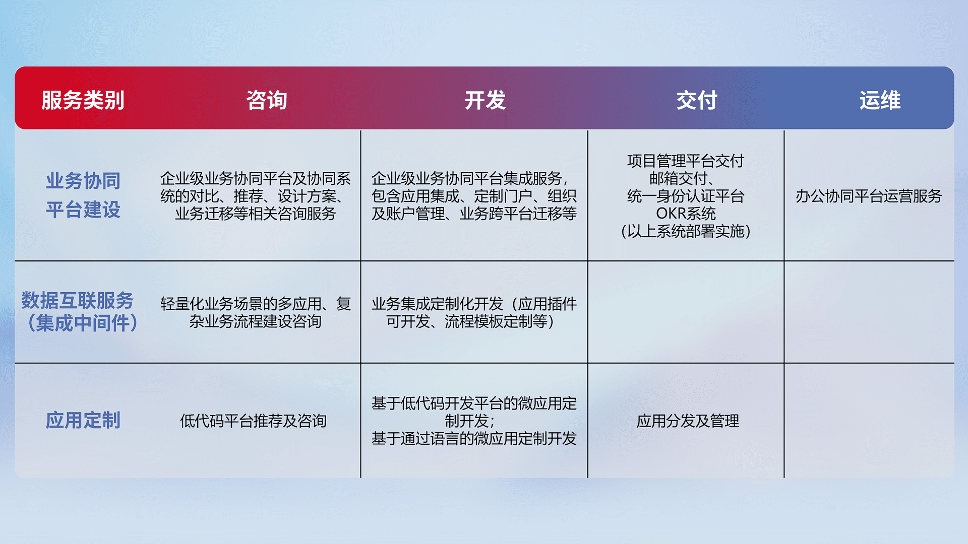 针对钉钉、、、企微、、、、IDaas等平台级产品提供产品的规划、、方案、、、交付、、定制化开发等服务,,,,实现如统一协同办公、、、智能客户服务、、混合会议管理、、智能数据查询、、等业务场景,,,实现数字化转型。。